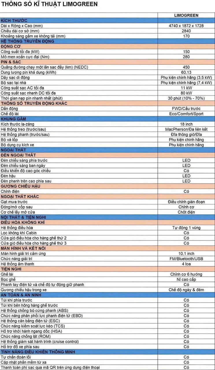 Thông số cơ bản Limo Green