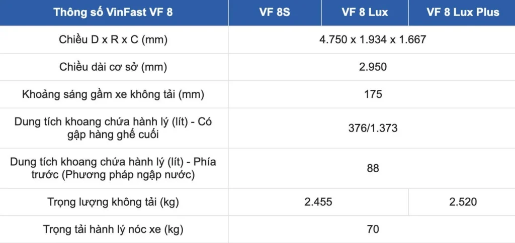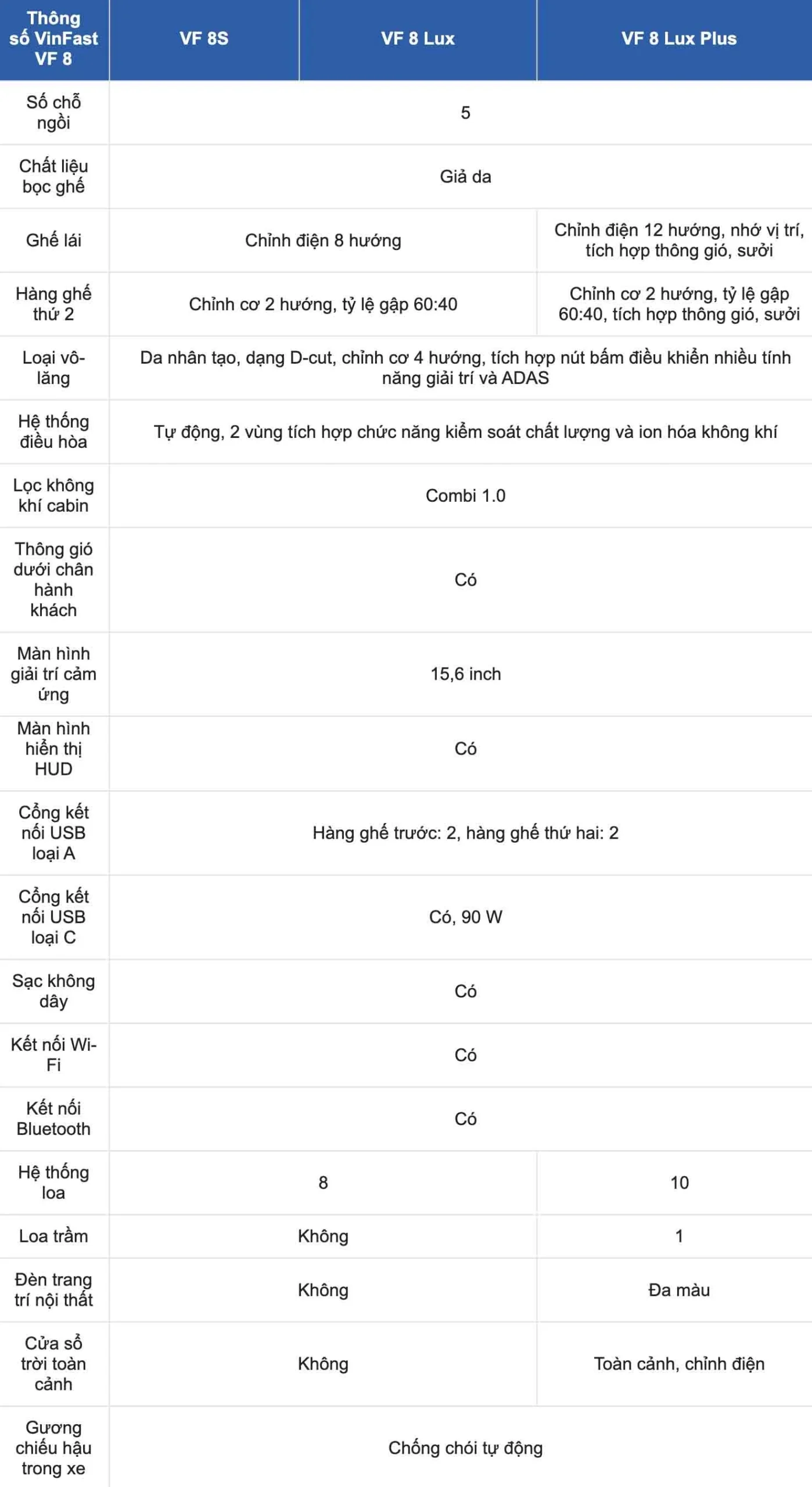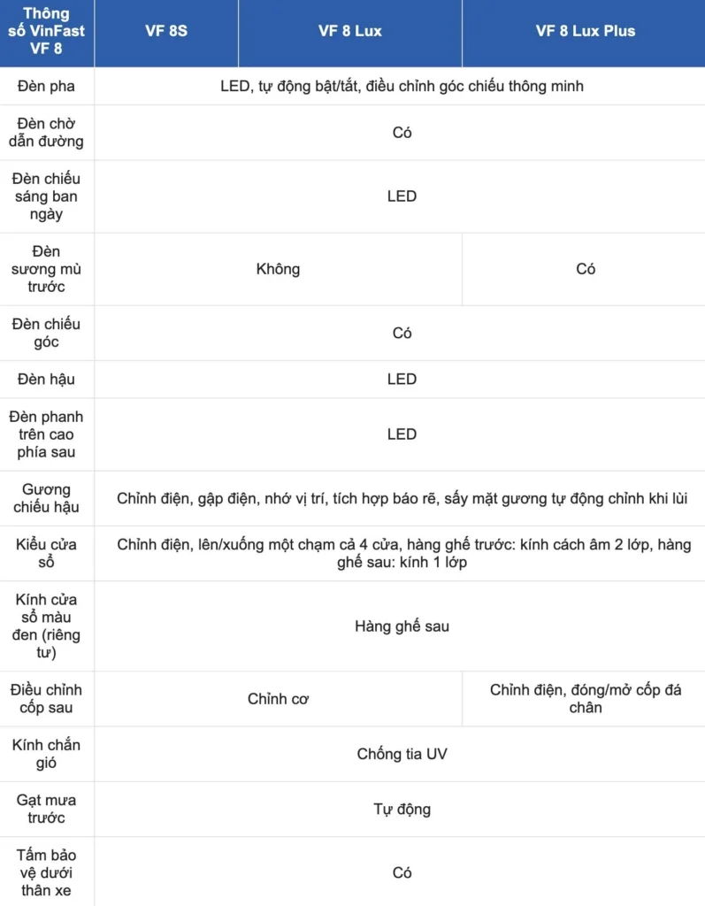| Tổng Quan | VF8 S | VF8 Lux | VF8 Lux Plus |